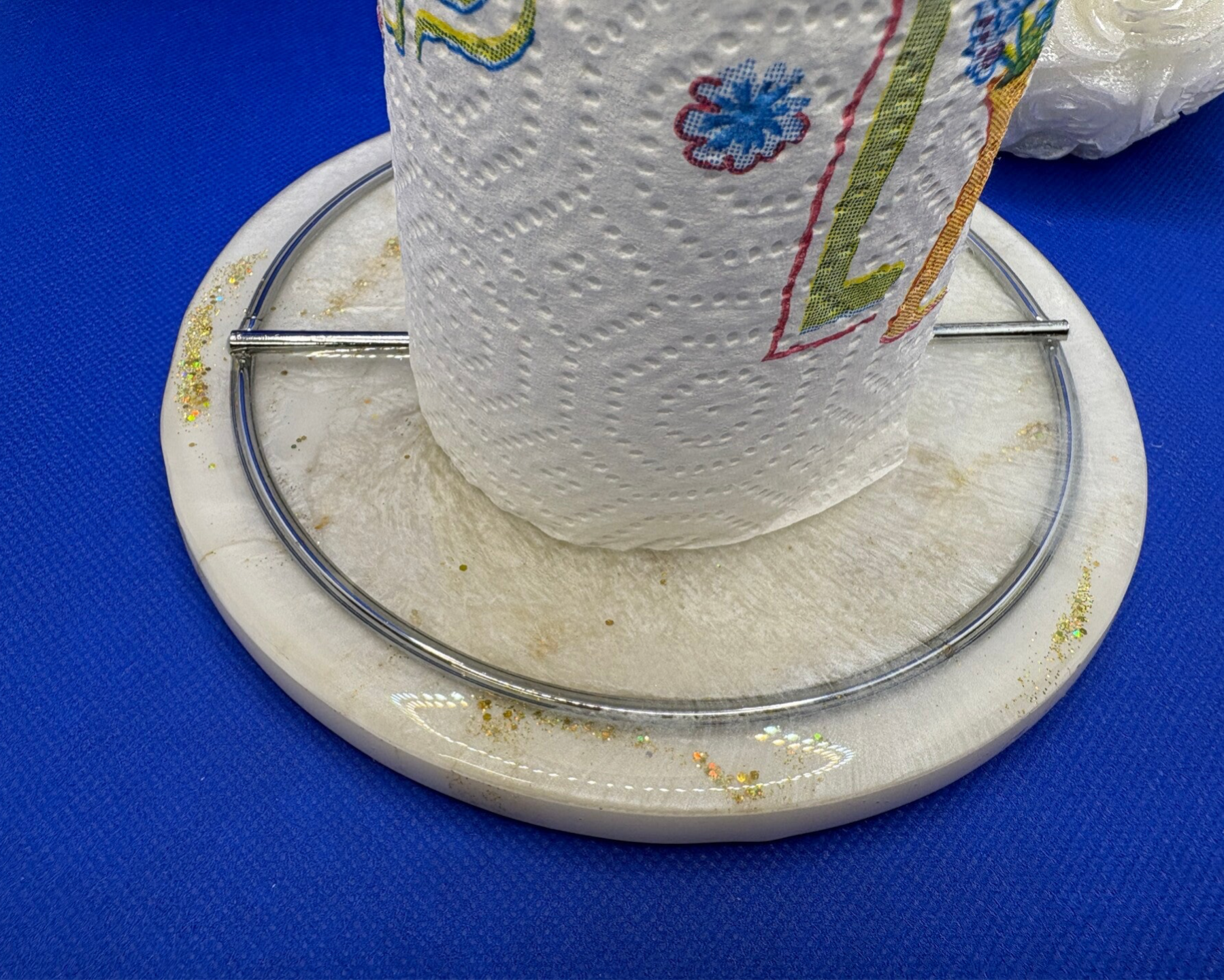 Der Küchenrollenhalter aus Epoxidharz in Weiß mit goldenen Glitzerpartikeln ist ein einzigartiges und handgemachtes Produkt, das Eleganz und Funktionalität in Ihre Küche bringt.
